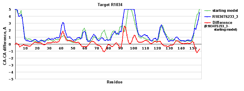 | Red line = (blue line) - (green thick line): difference between the corresponding Refined Model-Target and Starting Model-Target CA-CA distances (see above). Negative values show regions where the reifned model has better fit to the target than the starting model, i.e. areas of potential improvement. |