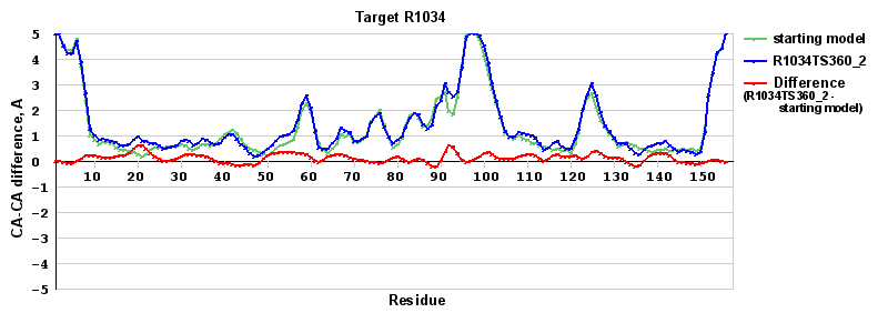 | Red line = (blue line) - (green thick line): difference between the corresponding Refined Model-Target and Starting Model-Target CA-CA distances (see above). Negative values show regions where the reifned model has better fit to the target than the starting model, i.e. areas of potential improvement. |