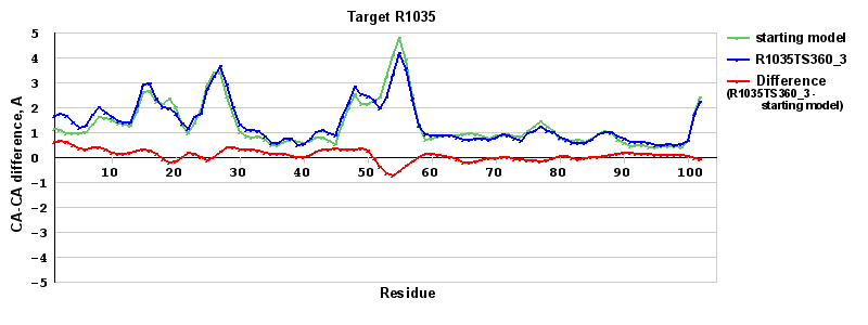 | Red line = (blue line) - (green thick line): difference between the corresponding Refined Model-Target and Starting Model-Target CA-CA distances (see above). Negative values show regions where the reifned model has better fit to the target than the starting model, i.e. areas of potential improvement. |