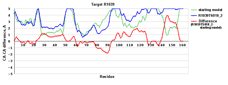 | Red line = (blue line) - (green thick line): difference between the corresponding Refined Model-Target and Starting Model-Target CA-CA distances (see above). Negative values show regions where the reifned model has better fit to the target than the starting model, i.e. areas of potential improvement. |