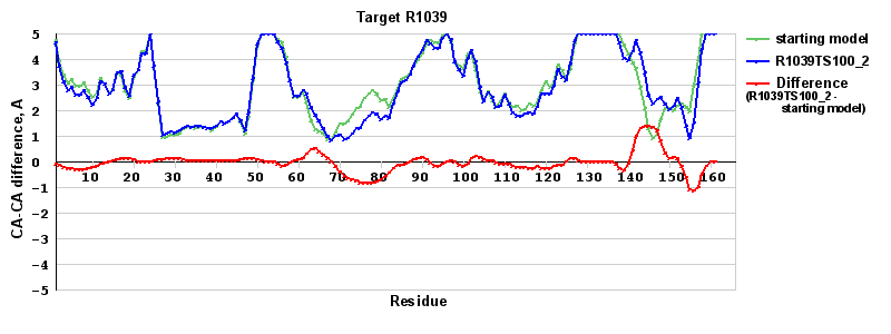 | Red line = (blue line) - (green thick line): difference between the corresponding Refined Model-Target and Starting Model-Target CA-CA distances (see above). Negative values show regions where the reifned model has better fit to the target than the starting model, i.e. areas of potential improvement. |
