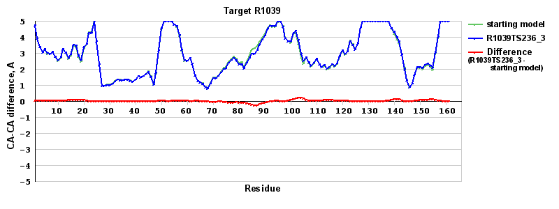 | Red line = (blue line) - (green thick line): difference between the corresponding Refined Model-Target and Starting Model-Target CA-CA distances (see above). Negative values show regions where the reifned model has better fit to the target than the starting model, i.e. areas of potential improvement. |