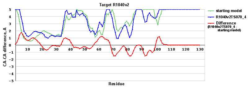 | Green line: distance between the aligned CA atoms in the starting model and the experimental structure in the LGA sequence-independent superposition under the 4A distance cutoff (see LGA description). |