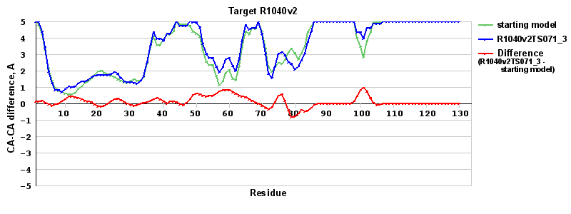 | Red line = (blue line) - (green thick line): difference between the corresponding Refined Model-Target and Starting Model-Target CA-CA distances (see above). Negative values show regions where the reifned model has better fit to the target than the starting model, i.e. areas of potential improvement. |