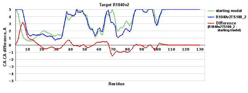 | Red line = (blue line) - (green thick line): difference between the corresponding Refined Model-Target and Starting Model-Target CA-CA distances (see above). Negative values show regions where the reifned model has better fit to the target than the starting model, i.e. areas of potential improvement. |