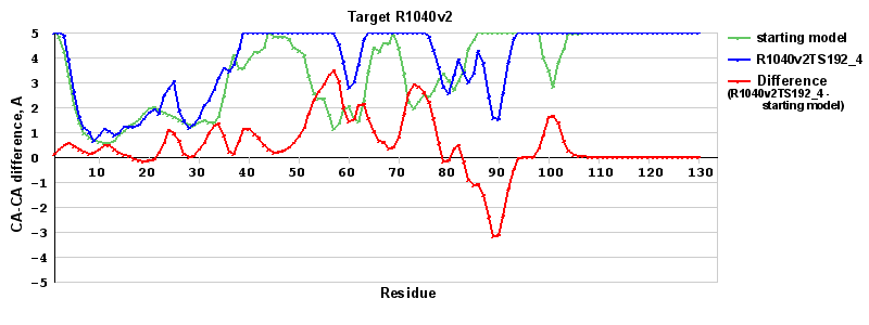| Red line = (blue line) - (green thick line): difference between the corresponding Refined Model-Target and Starting Model-Target CA-CA distances (see above). Negative values show regions where the reifned model has better fit to the target than the starting model, i.e. areas of potential improvement. |