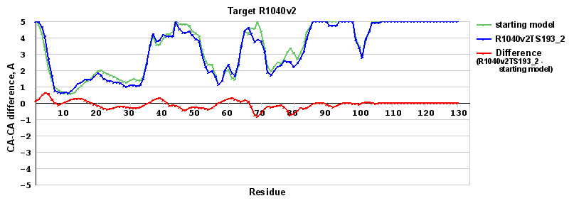 | Red line = (blue line) - (green thick line): difference between the corresponding Refined Model-Target and Starting Model-Target CA-CA distances (see above). Negative values show regions where the reifned model has better fit to the target than the starting model, i.e. areas of potential improvement. |