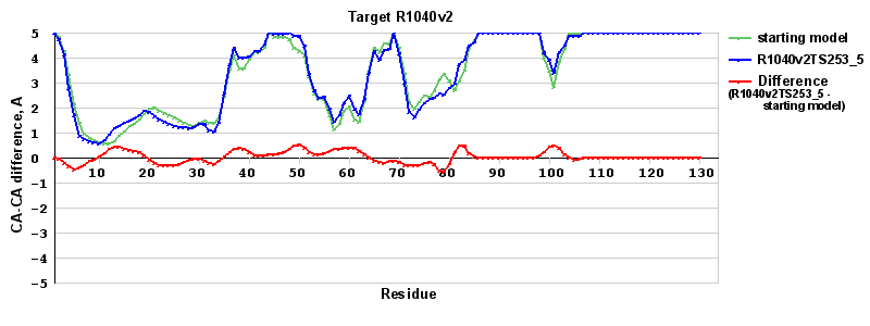 | Red line = (blue line) - (green thick line): difference between the corresponding Refined Model-Target and Starting Model-Target CA-CA distances (see above). Negative values show regions where the reifned model has better fit to the target than the starting model, i.e. areas of potential improvement. |