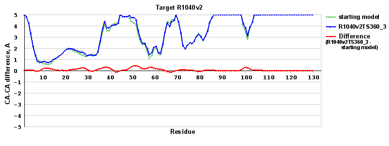 | Red line = (blue line) - (green thick line): difference between the corresponding Refined Model-Target and Starting Model-Target CA-CA distances (see above). Negative values show regions where the reifned model has better fit to the target than the starting model, i.e. areas of potential improvement. |