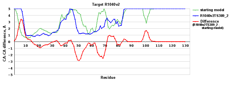 | Red line = (blue line) - (green thick line): difference between the corresponding Refined Model-Target and Starting Model-Target CA-CA distances (see above). Negative values show regions where the reifned model has better fit to the target than the starting model, i.e. areas of potential improvement. |