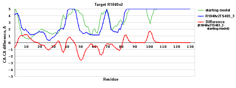 | Red line = (blue line) - (green thick line): difference between the corresponding Refined Model-Target and Starting Model-Target CA-CA distances (see above). Negative values show regions where the reifned model has better fit to the target than the starting model, i.e. areas of potential improvement. |