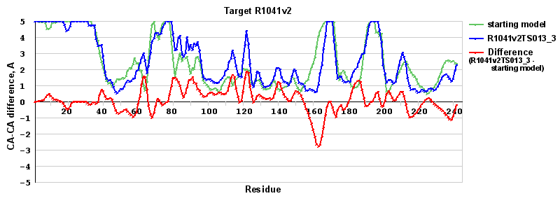 | Red line = (blue line) - (green thick line): difference between the corresponding Refined Model-Target and Starting Model-Target CA-CA distances (see above). Negative values show regions where the reifned model has better fit to the target than the starting model, i.e. areas of potential improvement. |