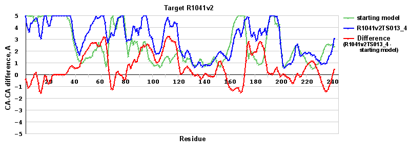 | Red line = (blue line) - (green thick line): difference between the corresponding Refined Model-Target and Starting Model-Target CA-CA distances (see above). Negative values show regions where the reifned model has better fit to the target than the starting model, i.e. areas of potential improvement. |