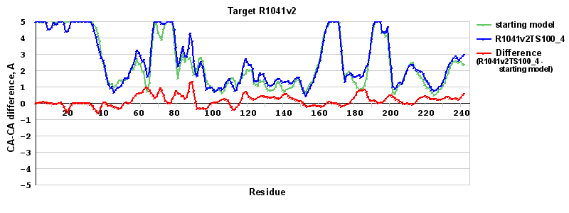 | Red line = (blue line) - (green thick line): difference between the corresponding Refined Model-Target and Starting Model-Target CA-CA distances (see above). Negative values show regions where the reifned model has better fit to the target than the starting model, i.e. areas of potential improvement. |