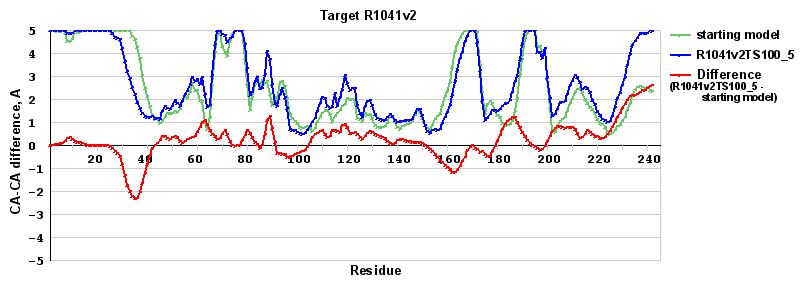 | Red line = (blue line) - (green thick line): difference between the corresponding Refined Model-Target and Starting Model-Target CA-CA distances (see above). Negative values show regions where the reifned model has better fit to the target than the starting model, i.e. areas of potential improvement. |