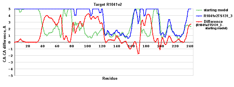 | Red line = (blue line) - (green thick line): difference between the corresponding Refined Model-Target and Starting Model-Target CA-CA distances (see above). Negative values show regions where the reifned model has better fit to the target than the starting model, i.e. areas of potential improvement. |