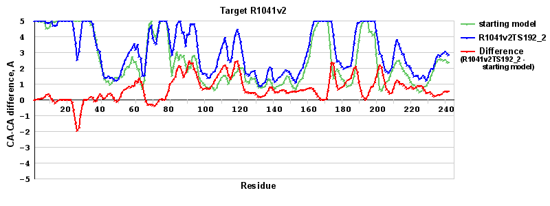 | Red line = (blue line) - (green thick line): difference between the corresponding Refined Model-Target and Starting Model-Target CA-CA distances (see above). Negative values show regions where the reifned model has better fit to the target than the starting model, i.e. areas of potential improvement. |