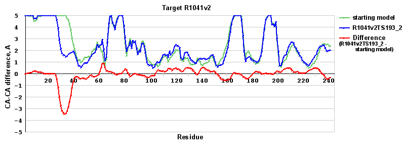 | Red line = (blue line) - (green thick line): difference between the corresponding Refined Model-Target and Starting Model-Target CA-CA distances (see above). Negative values show regions where the reifned model has better fit to the target than the starting model, i.e. areas of potential improvement. |