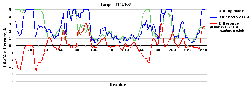 | Red line = (blue line) - (green thick line): difference between the corresponding Refined Model-Target and Starting Model-Target CA-CA distances (see above). Negative values show regions where the reifned model has better fit to the target than the starting model, i.e. areas of potential improvement. |