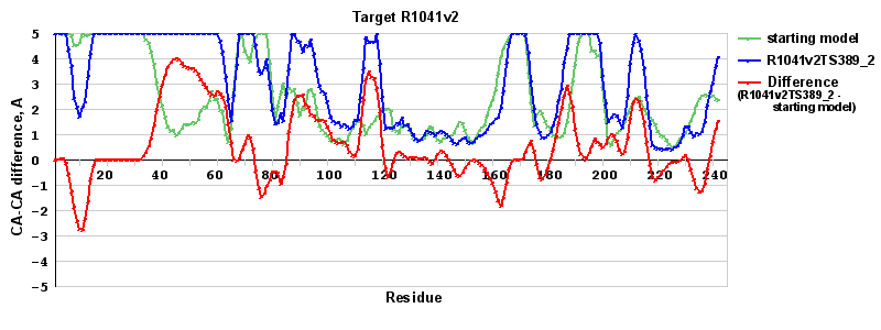 | Red line = (blue line) - (green thick line): difference between the corresponding Refined Model-Target and Starting Model-Target CA-CA distances (see above). Negative values show regions where the reifned model has better fit to the target than the starting model, i.e. areas of potential improvement. |