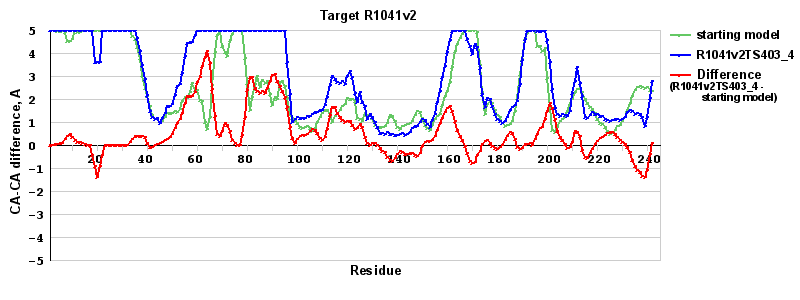 | Red line = (blue line) - (green thick line): difference between the corresponding Refined Model-Target and Starting Model-Target CA-CA distances (see above). Negative values show regions where the reifned model has better fit to the target than the starting model, i.e. areas of potential improvement. |