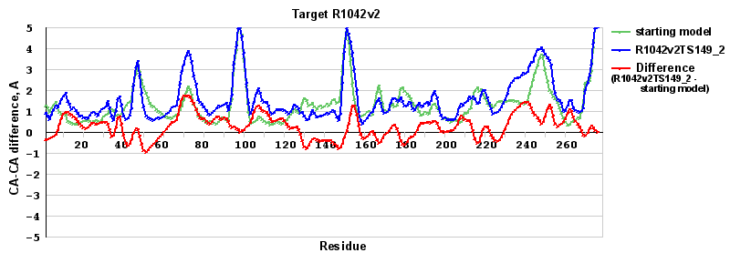 | Red line = (blue line) - (green thick line): difference between the corresponding Refined Model-Target and Starting Model-Target CA-CA distances (see above). Negative values show regions where the reifned model has better fit to the target than the starting model, i.e. areas of potential improvement. |