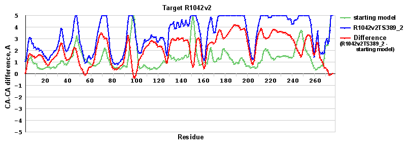 | Red line = (blue line) - (green thick line): difference between the corresponding Refined Model-Target and Starting Model-Target CA-CA distances (see above). Negative values show regions where the reifned model has better fit to the target than the starting model, i.e. areas of potential improvement. |