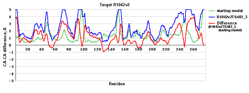 | Red line = (blue line) - (green thick line): difference between the corresponding Refined Model-Target and Starting Model-Target CA-CA distances (see above). Negative values show regions where the reifned model has better fit to the target than the starting model, i.e. areas of potential improvement. |