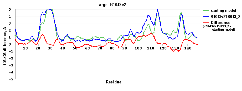 | Red line = (blue line) - (green thick line): difference between the corresponding Refined Model-Target and Starting Model-Target CA-CA distances (see above). Negative values show regions where the reifned model has better fit to the target than the starting model, i.e. areas of potential improvement. |