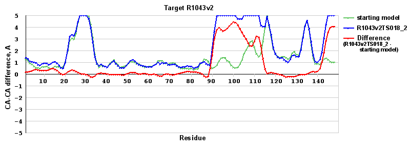 | Red line = (blue line) - (green thick line): difference between the corresponding Refined Model-Target and Starting Model-Target CA-CA distances (see above). Negative values show regions where the reifned model has better fit to the target than the starting model, i.e. areas of potential improvement. |