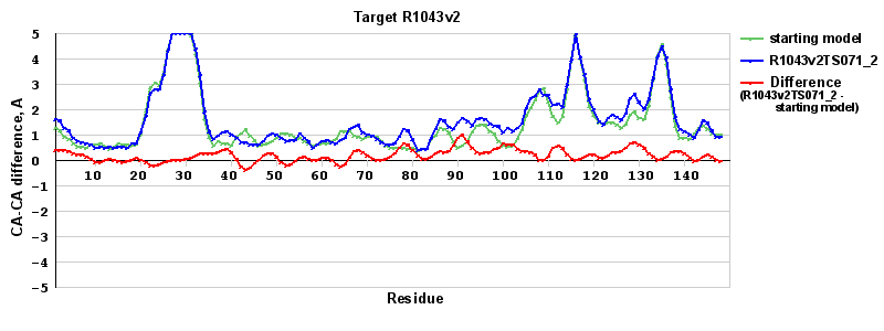 | Red line = (blue line) - (green thick line): difference between the corresponding Refined Model-Target and Starting Model-Target CA-CA distances (see above). Negative values show regions where the reifned model has better fit to the target than the starting model, i.e. areas of potential improvement. |