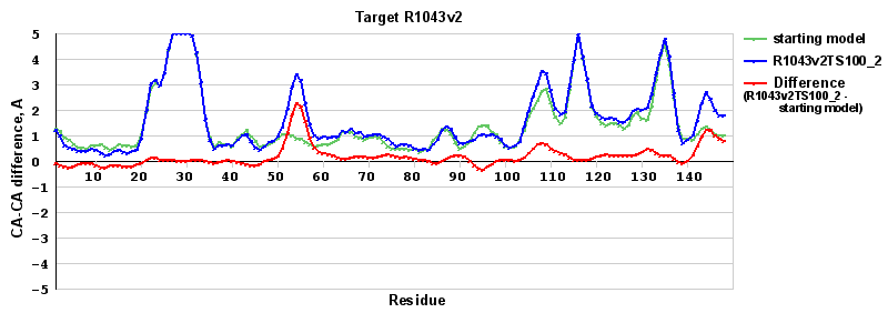 | Red line = (blue line) - (green thick line): difference between the corresponding Refined Model-Target and Starting Model-Target CA-CA distances (see above). Negative values show regions where the reifned model has better fit to the target than the starting model, i.e. areas of potential improvement. |