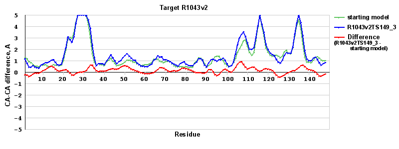 | Red line = (blue line) - (green thick line): difference between the corresponding Refined Model-Target and Starting Model-Target CA-CA distances (see above). Negative values show regions where the reifned model has better fit to the target than the starting model, i.e. areas of potential improvement. |