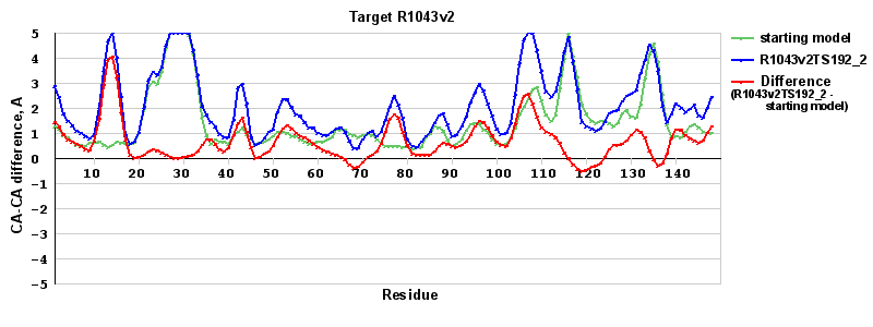 | Red line = (blue line) - (green thick line): difference between the corresponding Refined Model-Target and Starting Model-Target CA-CA distances (see above). Negative values show regions where the reifned model has better fit to the target than the starting model, i.e. areas of potential improvement. |