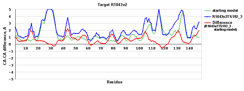 | Red line = (blue line) - (green thick line): difference between the corresponding Refined Model-Target and Starting Model-Target CA-CA distances (see above). Negative values show regions where the reifned model has better fit to the target than the starting model, i.e. areas of potential improvement. |