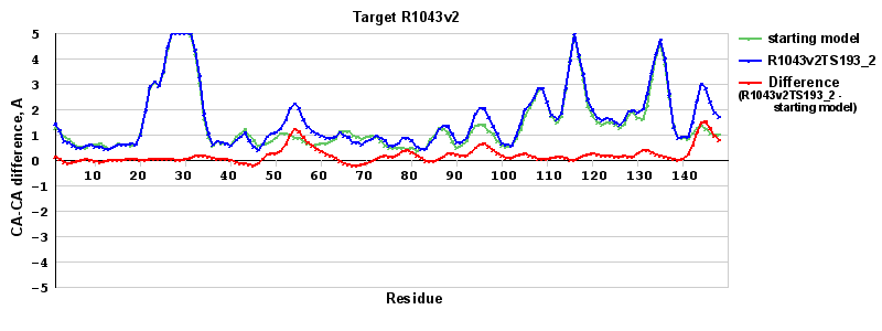 | Red line = (blue line) - (green thick line): difference between the corresponding Refined Model-Target and Starting Model-Target CA-CA distances (see above). Negative values show regions where the reifned model has better fit to the target than the starting model, i.e. areas of potential improvement. |