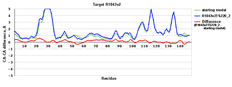 | Red line = (blue line) - (green thick line): difference between the corresponding Refined Model-Target and Starting Model-Target CA-CA distances (see above). Negative values show regions where the reifned model has better fit to the target than the starting model, i.e. areas of potential improvement. |