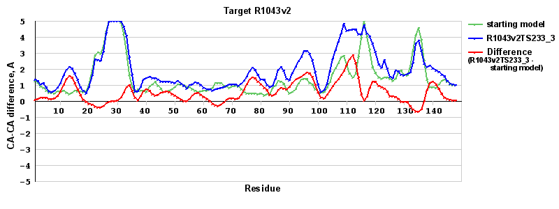 | Red line = (blue line) - (green thick line): difference between the corresponding Refined Model-Target and Starting Model-Target CA-CA distances (see above). Negative values show regions where the reifned model has better fit to the target than the starting model, i.e. areas of potential improvement. |