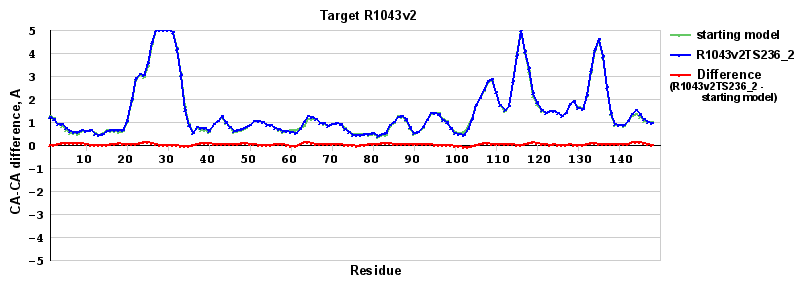 | Red line = (blue line) - (green thick line): difference between the corresponding Refined Model-Target and Starting Model-Target CA-CA distances (see above). Negative values show regions where the reifned model has better fit to the target than the starting model, i.e. areas of potential improvement. |