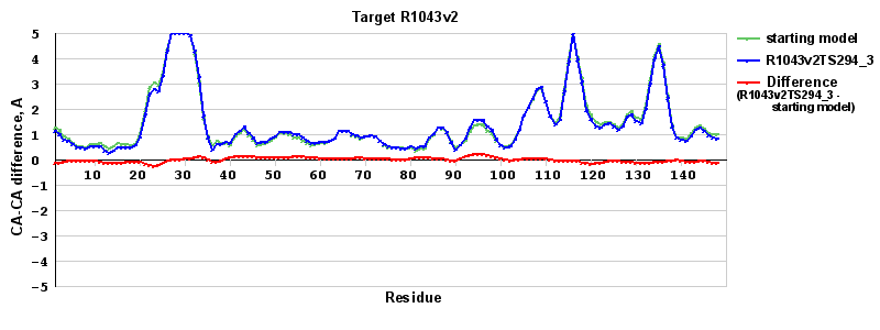 | Red line = (blue line) - (green thick line): difference between the corresponding Refined Model-Target and Starting Model-Target CA-CA distances (see above). Negative values show regions where the reifned model has better fit to the target than the starting model, i.e. areas of potential improvement. |