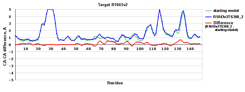| Red line = (blue line) - (green thick line): difference between the corresponding Refined Model-Target and Starting Model-Target CA-CA distances (see above). Negative values show regions where the reifned model has better fit to the target than the starting model, i.e. areas of potential improvement. |