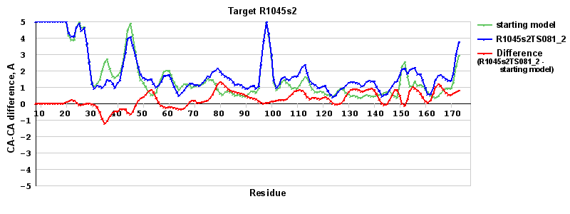 | Red line = (blue line) - (green thick line): difference between the corresponding Refined Model-Target and Starting Model-Target CA-CA distances (see above). Negative values show regions where the reifned model has better fit to the target than the starting model, i.e. areas of potential improvement. |