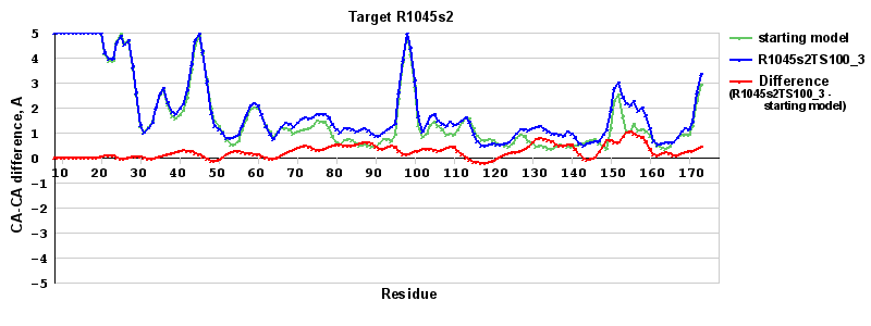 | Red line = (blue line) - (green thick line): difference between the corresponding Refined Model-Target and Starting Model-Target CA-CA distances (see above). Negative values show regions where the reifned model has better fit to the target than the starting model, i.e. areas of potential improvement. |