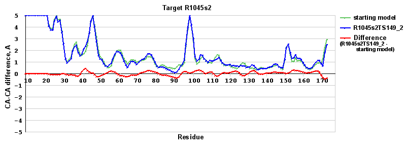 | Red line = (blue line) - (green thick line): difference between the corresponding Refined Model-Target and Starting Model-Target CA-CA distances (see above). Negative values show regions where the reifned model has better fit to the target than the starting model, i.e. areas of potential improvement. |