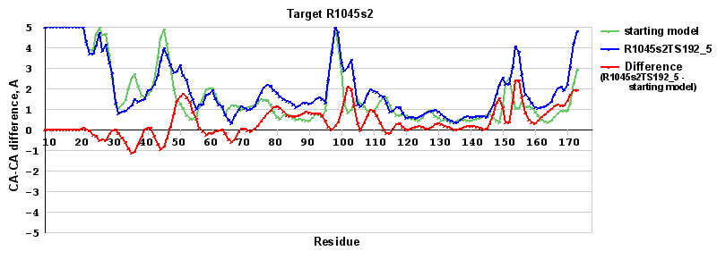 | Red line = (blue line) - (green thick line): difference between the corresponding Refined Model-Target and Starting Model-Target CA-CA distances (see above). Negative values show regions where the reifned model has better fit to the target than the starting model, i.e. areas of potential improvement. |