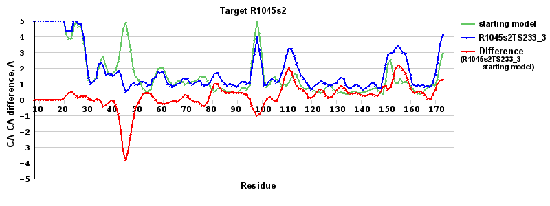 | Red line = (blue line) - (green thick line): difference between the corresponding Refined Model-Target and Starting Model-Target CA-CA distances (see above). Negative values show regions where the reifned model has better fit to the target than the starting model, i.e. areas of potential improvement. |
