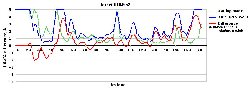 | Red line = (blue line) - (green thick line): difference between the corresponding Refined Model-Target and Starting Model-Target CA-CA distances (see above). Negative values show regions where the reifned model has better fit to the target than the starting model, i.e. areas of potential improvement. |