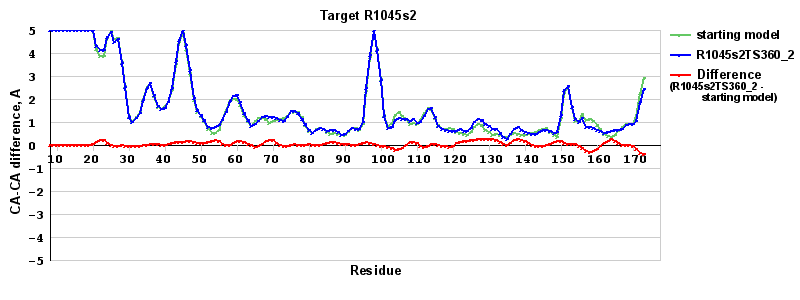 | Red line = (blue line) - (green thick line): difference between the corresponding Refined Model-Target and Starting Model-Target CA-CA distances (see above). Negative values show regions where the reifned model has better fit to the target than the starting model, i.e. areas of potential improvement. |