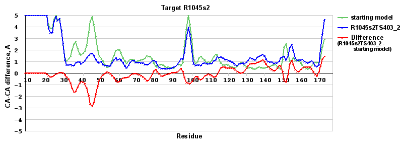 | Red line = (blue line) - (green thick line): difference between the corresponding Refined Model-Target and Starting Model-Target CA-CA distances (see above). Negative values show regions where the reifned model has better fit to the target than the starting model, i.e. areas of potential improvement. |