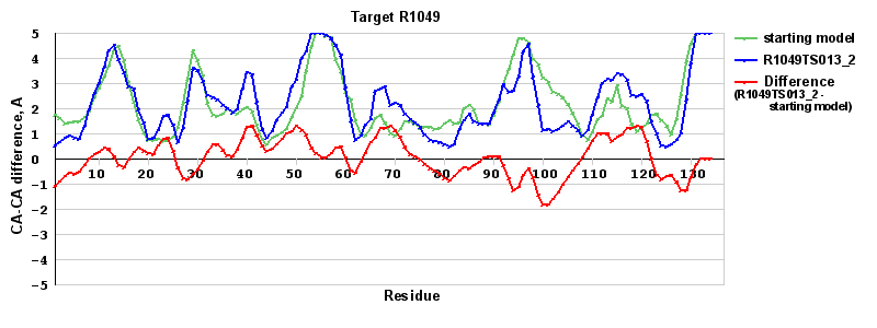 | Red line = (blue line) - (green thick line): difference between the corresponding Refined Model-Target and Starting Model-Target CA-CA distances (see above). Negative values show regions where the reifned model has better fit to the target than the starting model, i.e. areas of potential improvement. |